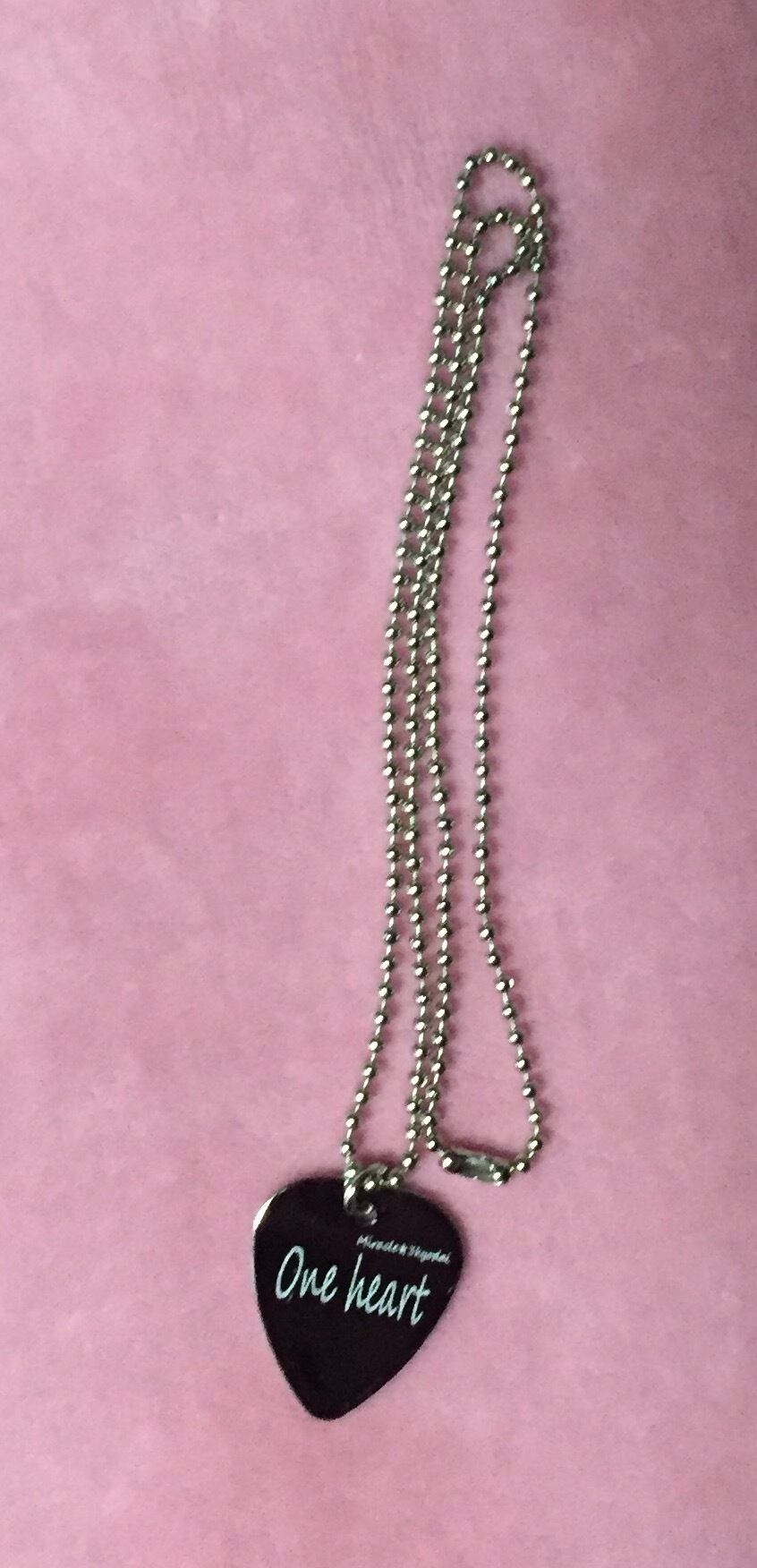 ステンレス製のティアドロップ型ピックにOne heartの文字を